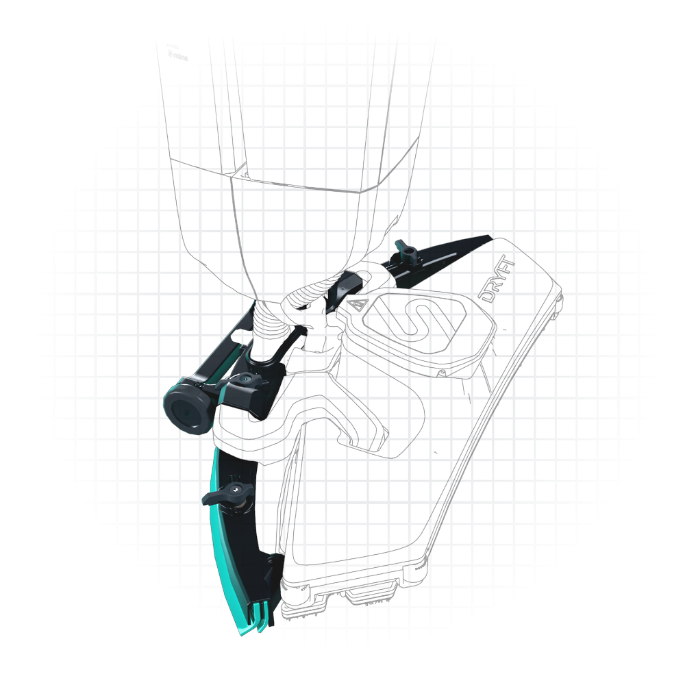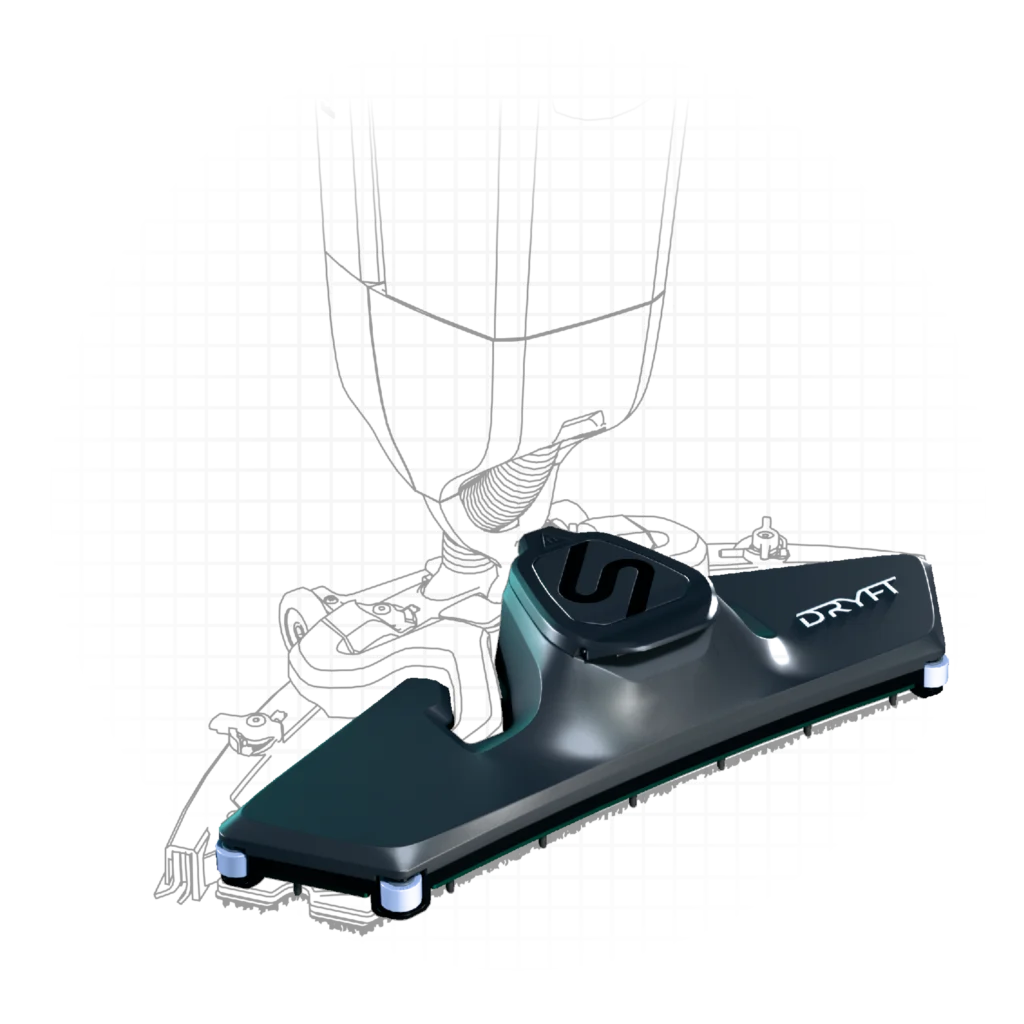 DRYFT to pierwsza szorowarka zaprojektowana z minimalistyczną głowicą czyszczącą – mieszczącą jedynie silnik szorujący i ssawy. Wszystkie pozostałe komponenty, w tym elektronika, akumulator i układy płynów, zostały przeniesione na górny uchwyt, strategicznie rozmieszczony dla: