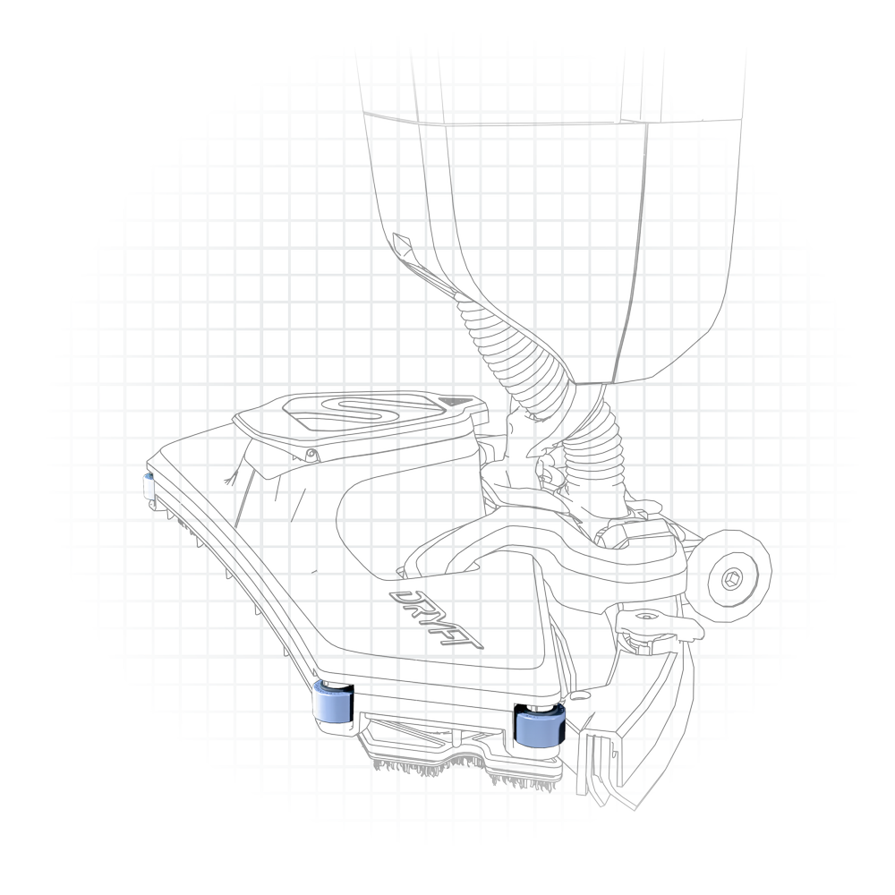 DRYFT rozwiązuje ten problem dzięki opatentowanemu systemowi kół ślizgowych, płynnie zintegrowanemu z górną częścią głowicy czyszczącej. Te zagłębione, niskotarciowe koła prowadzące: